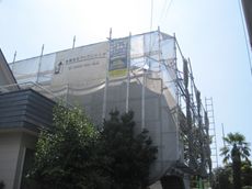 | まずは足場を設置します。 | 屋根の足場も設置です。 | 別角度から撮りました。 |