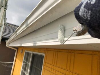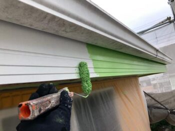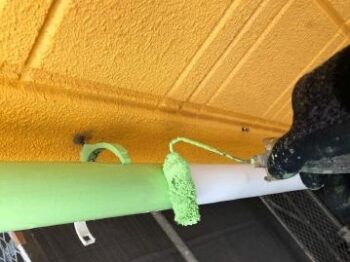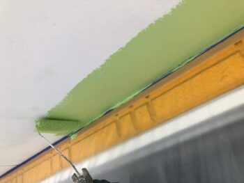 軒天上塗り1回目 白から淡いグリーンへと塗り替えられていきます