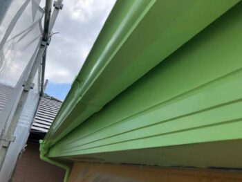 破風・軒樋上塗り1回目 軒天の色と同じく淡いグリーンで塗装します