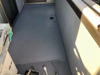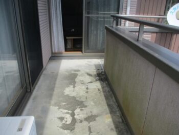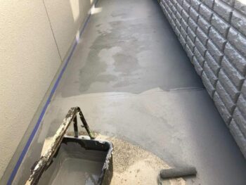 ベランダ上塗り2回目 汚れ等が目立ったベランダ床がきれいに仕上がっていきます
