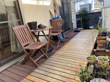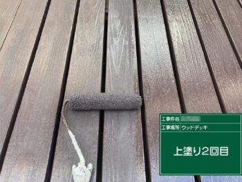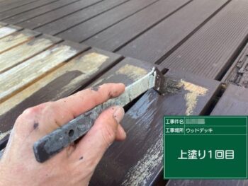 ウッドデッキ上塗り1回目 色褪せていたウッドデッキはこげ茶色に塗装しました