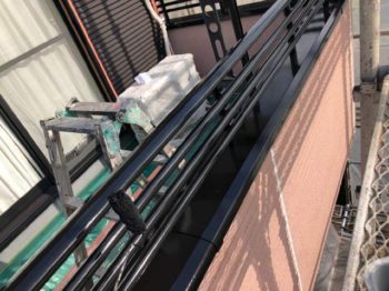 外壁上塗り1回目 ベランダ外壁(アクセント)についてはベースの色より濃い色で仕上げます(19-50H)。