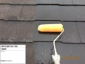 屋根下塗り1回目 透明なシーラーを塗布します。