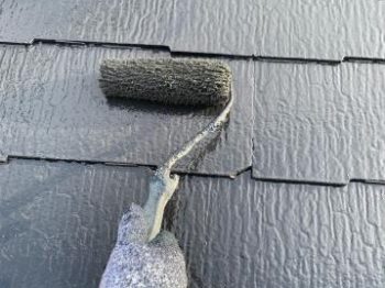 屋根上塗り1回目 施工前と同じ黒で仕上げます。