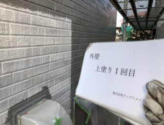 外壁上塗り1回目 ベースとなるグレーの塗料を塗り重ねていきます。