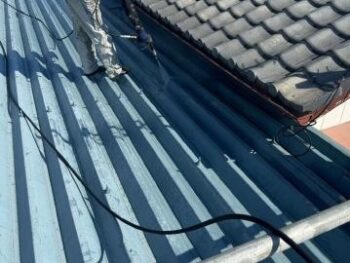 屋根上塗り1回目 現状の水色で塗装させて頂きました