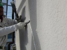 | マスキングテープを貼ってシーリングの打ち替えを行います。 | クラックの部分にはモルタル処理をしました。 | こちらもモルタル処理をします。 |