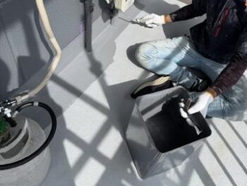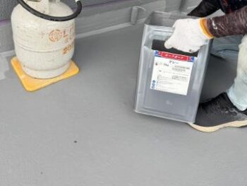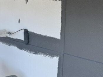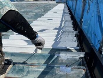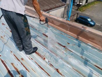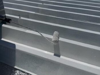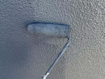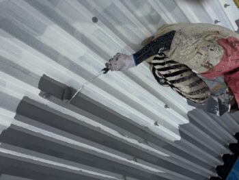 屋根上塗り1回目 グレー系の色で塗装されていきます