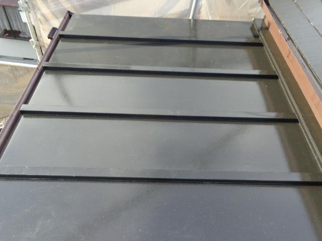 | 上塗りに入る前にタスペーサーを挿入します。最終工程に入る前に行います。 | シャッターの塗装にかかります。錆止めを行ったので、塗料との密着性が高まっています。 | 上塗りの工程に入ります。屋根の塗装の仕上げ段階になります。 |