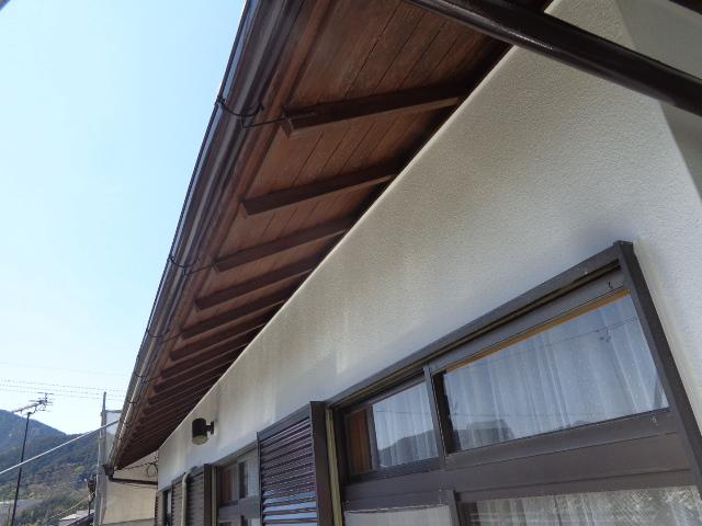 | 軒天は木製なので、はがれ等見られます。 | 玄関扉の色も褪せてきていたのでこちらも塗装します。 | 樋も色褪せていました。 |