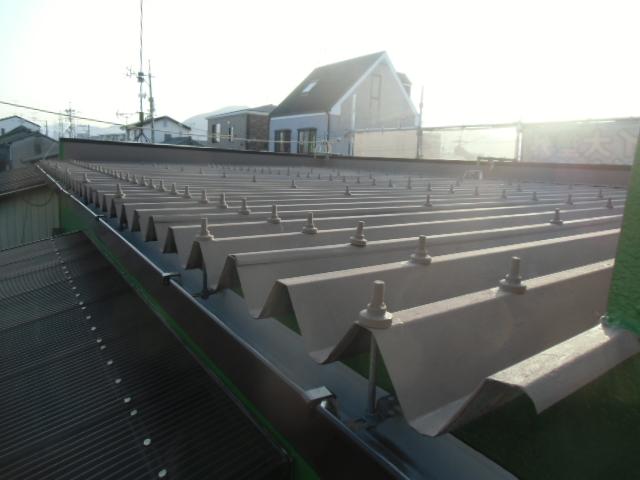 | 屋根の1回目の下塗りが完了しました。 | 2回目の下塗りの後、ボルトキャップを取り付けました。 | 屋根の上塗りを行います。この後2回目の上塗りを行います。 |
