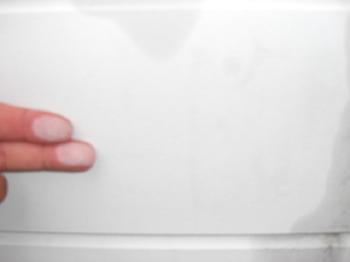 | 塗装前の外観です。外壁には水アカなどの汚れが目立ちます。 | 外壁を触るとチョーキング現象を起こしていました。 |