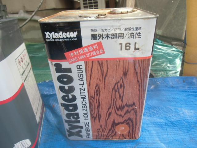 | 木部の塗装に使用した塗料です。 | 軒天木部の塗装に入ります。 | 亀裂が生じていた箇所にはクラック処理を行います。 |