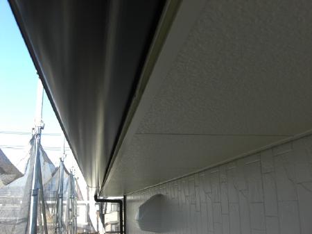 | 雨樋、軒天も塗装完了です。 | 施工後の階段です。手すりも塗装されて清潔感が増しました。 | シャッターも綺麗に塗装されました。 |