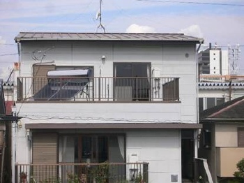 | 施工前の全体写真です。雨風で塗料が薄くなってきているのが分かります。 | 屋根塗装リフォームの施工前写真です。汚れと錆が目立ちます。 | ||