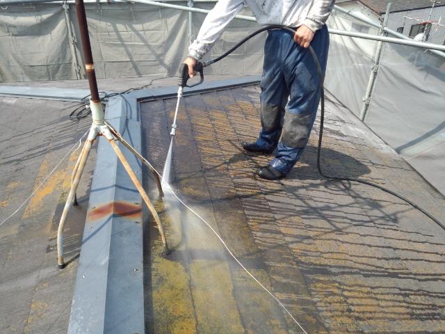 | 足場が架かりました。これで施工が出来ます。 | 屋根の高圧洗浄を行います。苔がきれいに落ちていきます。 | 外壁も高圧洗浄によりきれいにしていきます。 |