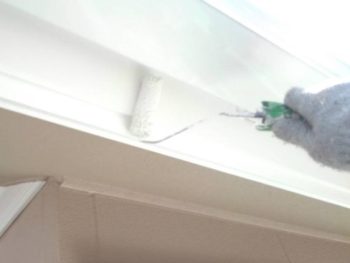 軒天下塗り1回目 リシンのため外壁の下塗り材(パーフェクトサーフ)を使用しました。