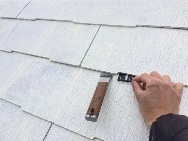 | 屋根の2回目の下塗りです。 | タスペーサーを一つ一つ挿入していきます。 | 屋根の1回目の上塗りです。 |